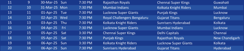 - Opening Match: Kolkata Knight Riders (KKR) vs. Royal Challengers Bengaluru (RCB) at Eden Gardens, Kolkata.