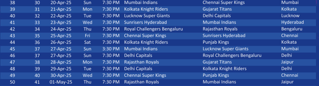 - Rivalry Matches: Big games like MI vs. CSK and RCB vs. KKR.