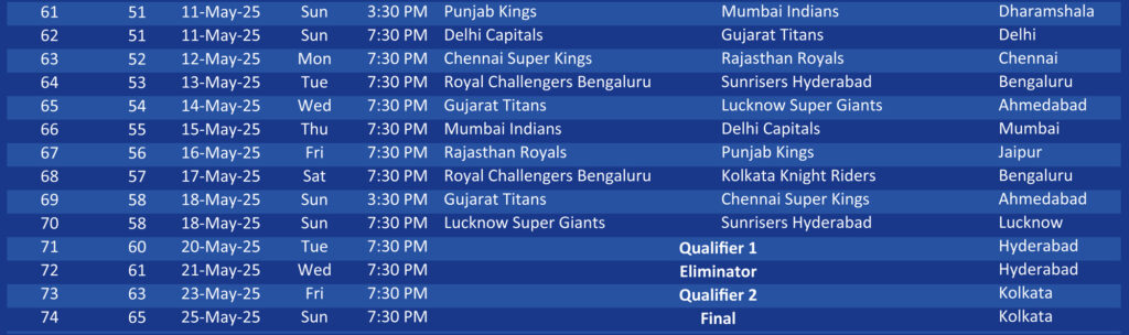 - Final Match: May 25, 2025, at Eden Gardens, Kolkata.